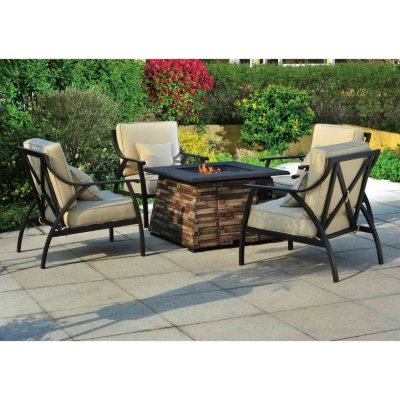 5-Piece Fire Pit Set • Set includes four gliding chairs and a fire pit • • Coated and treated for outdoor weather protection • • Rust free frames for life • propane tank (not included) • Fabric UV protected and stain resistant ... Access Document